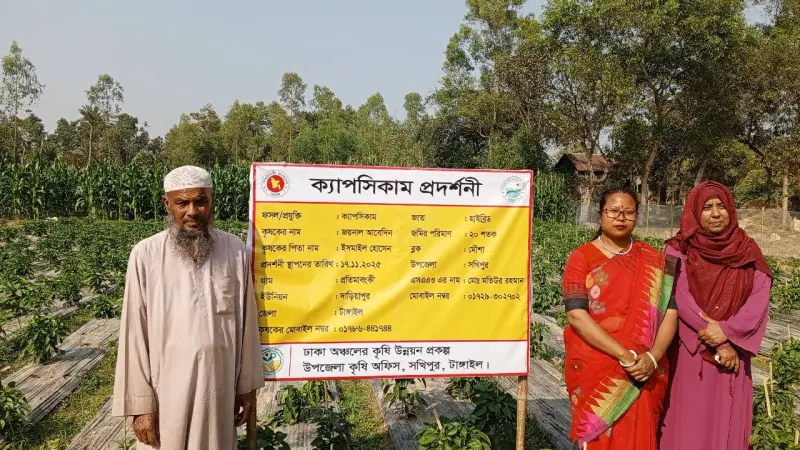 টাঙ্গাইলের সখীপুরে প্রথমবারের মতো ভিনদেশি সবজি ক্যাপসিকাম চাষ করে সফলতার স্বপ্ন বুনছেন কৃষি উদ্যোক্তা জয়নাল আবেদীন। ঢাকা অঞ্চলের কৃষি উন্নয়ন প্রকল্পের আওতায় এবং উপজেলা কৃষি কার্যালয়ের সহযোগিতায় তিনি প্রতিমাবংকী এলাকায় সমতল জনপদে এই বৈচিত্র্যময় সবজির চাষ শুরু করেছেন।