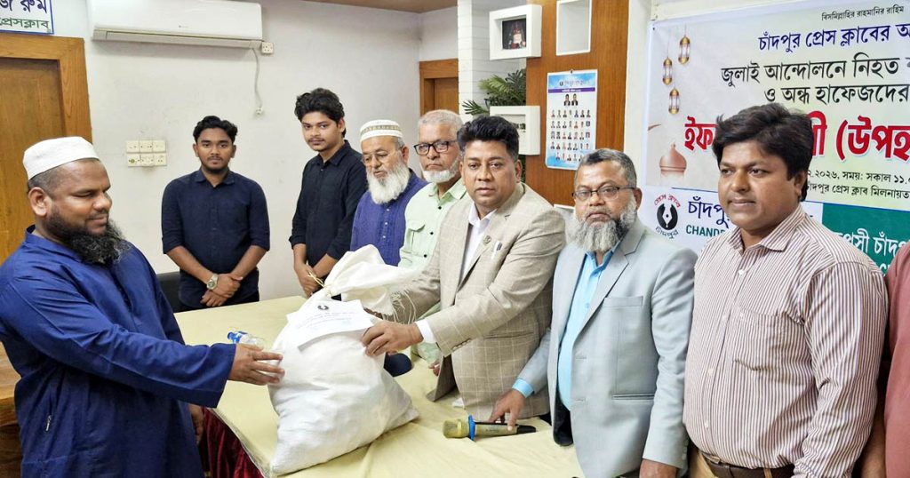 নিজস্ব প্রতিবেদক,অমৃতালোকঃ চাঁদপুর প্রেসক্লাবের ব্যবস্থাপনায় ১৬জন অন্ধ হাফেজ ও জুলাই আন্দোলনে নিহত ২৪ শহীদ পরিবারের সদস্যদের মাজে ইফতার সামগ্রী উপহার প্রদান করা হয়েছে। বুধবার দুপুরে প্রেসক্লাব মিলনায়তনে আনুষ্ঠানিকভাবে এসব ইফতার সামগ্রী প্রদানের আয়োজন করে রূপসী চাঁদপুর ফাউন্ডেশন নিউইয়র্ক ইনক নামে স্বেচ্ছাসেবী সংগঠন। অনুষ্ঠানে প্রধান অতিথি হিসেবে উপস্থিত থেকে অন্ধ হাফেজ ও শহীদ পরিবারের সদস্যদের হাতে […]
