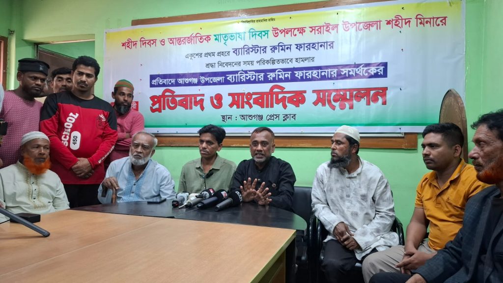 সরাইলে শহীদ মিনারে হামলার প্রতিবাদে আশুগঞ্জে রুমিন ফারহানার সমর্থকদের প্রতিবাদ ও সংবাদ সম্মেলন